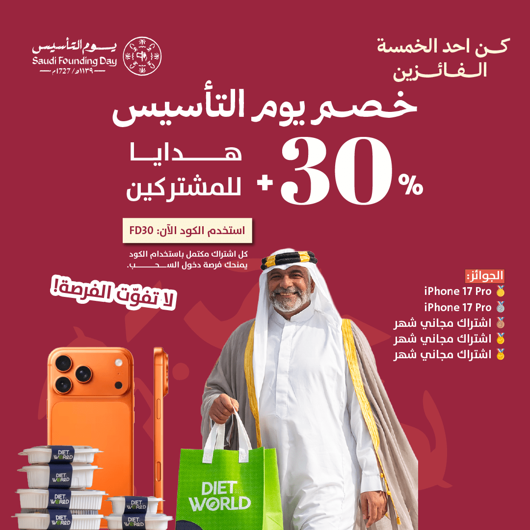 اشترك اليوم في دايت ورلد واحصل على خصم 30% + دخول السحب على جوائز مميزة 🎁 كل اشتراك باستخدام كود FD30 يمنحك فرصة للفوز!